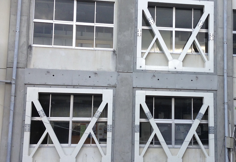 コンクリート建築物の耐震補強工事は建造物の強度を増加させるために鉄骨ブレスでの補強や増設壁のように新に耐震壁の増設をしたり既存の壁を厚くして強度を増加させる工法がある。