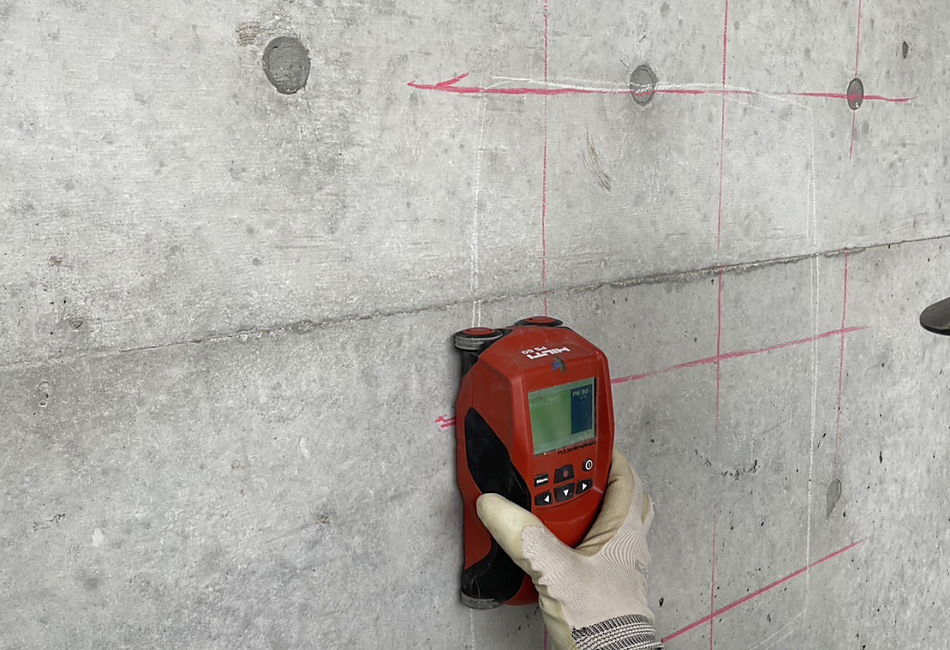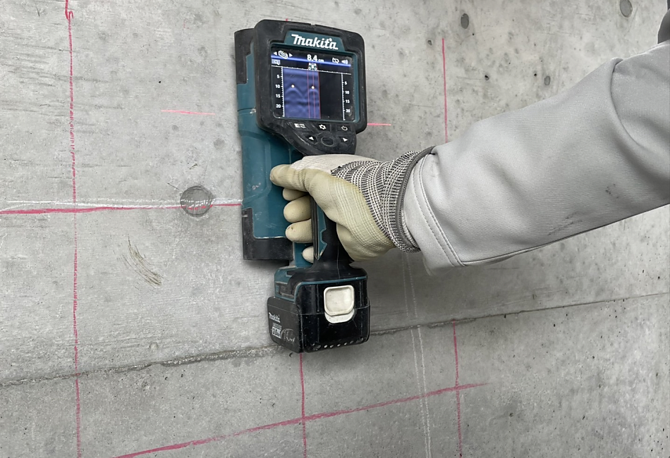 コンクリート構造物の柱.梁.壁などのコンクリート内部の鉄筋や電菅などの位置を調査し現地にて目視で分かるように現地の壁などにチョークでケガキ、報告書を作成する。