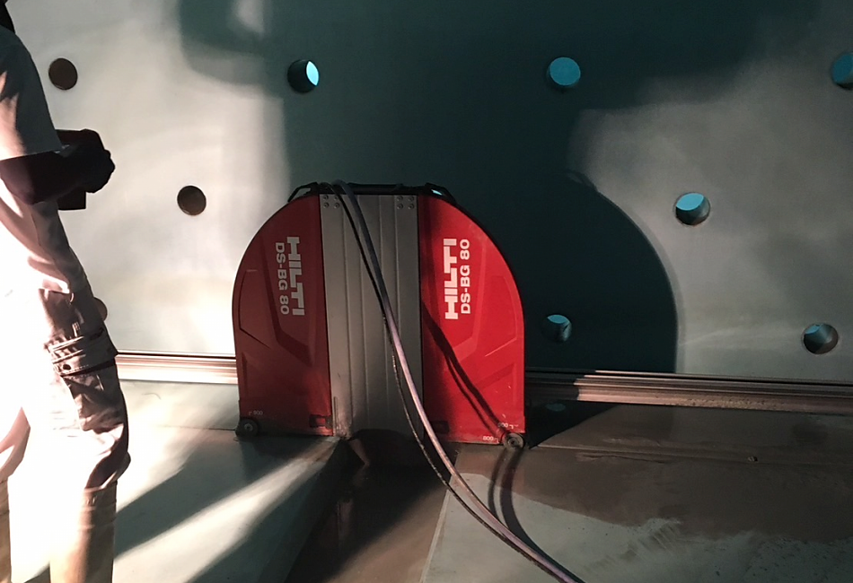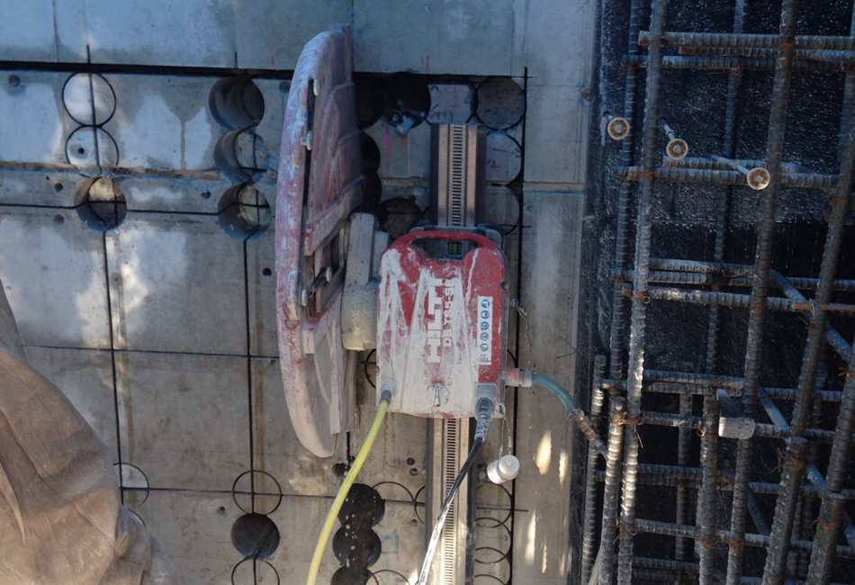 ウォールソーイング工事ではハンドカッターなどの使用が困難な厚い壁やエンジンカッター・道路カッターなどのCO2を排出すると酸欠の危険性のある室内での使用が困難場所で適している。増築に伴う開口増設、腰壁の撤去や解体工事の施工に適している。