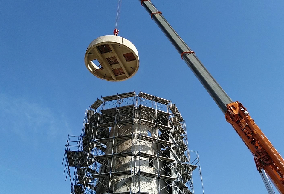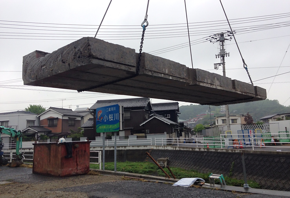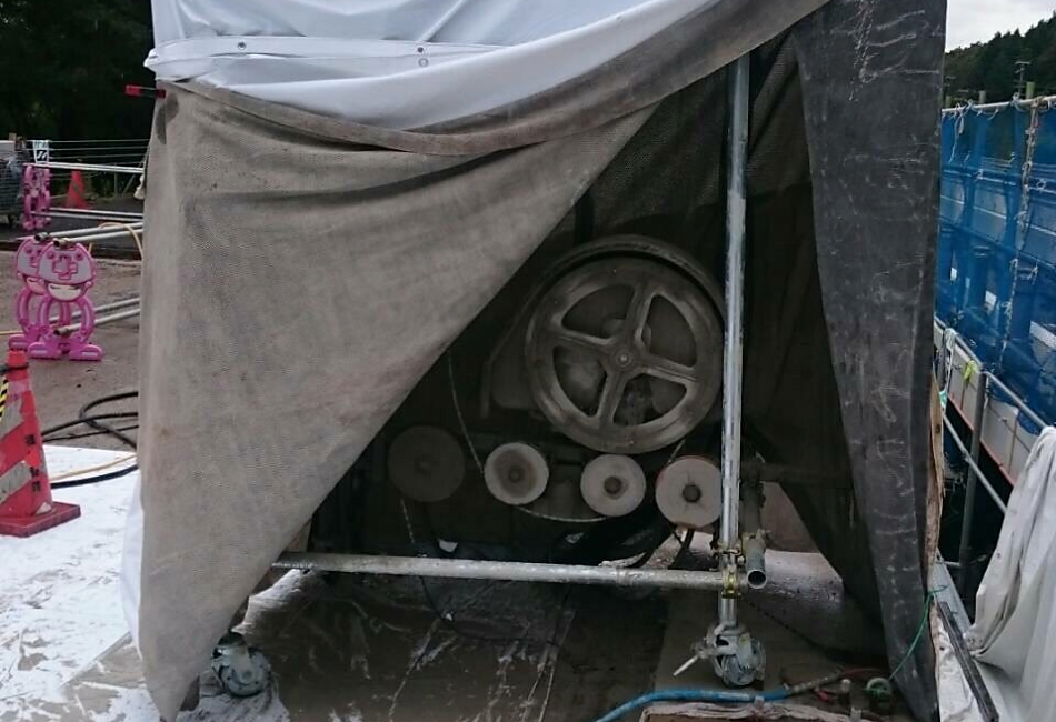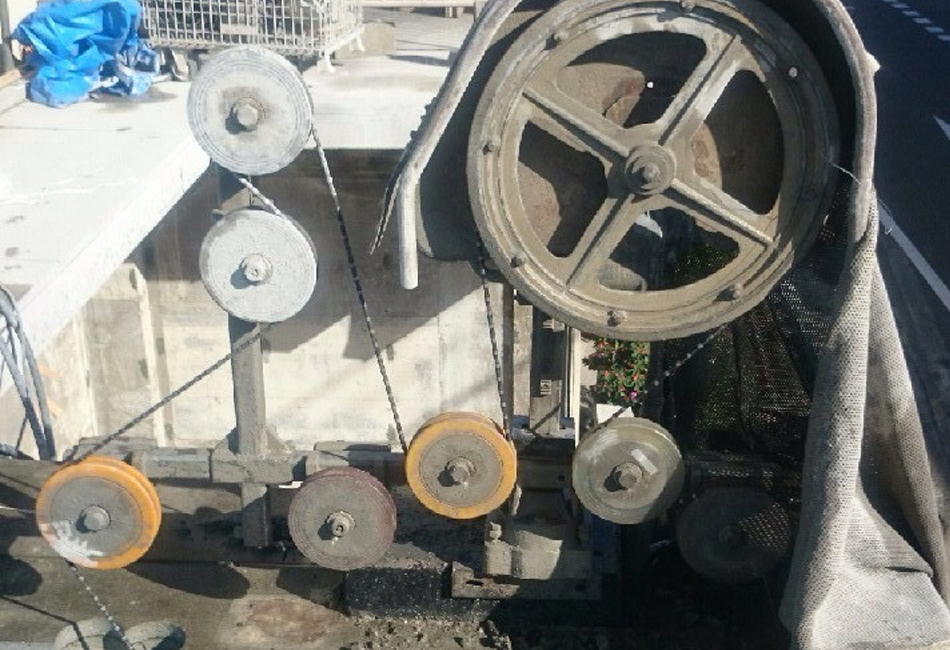 ワイヤーソーイングは切断するコンクリート構造物に直径10mm~11mmほどのワイヤーにダイヤモンドチップがかしめられているワイヤーを切断面に巻き付け一定の張力をかけながらメインプーリーを高速回転させることによって切断する工法です。ワイヤーソーを通すことができれば複雑な形状や大断面の切断、狭い場所での施工や煙突などの切断撤去などの高所作業でも切断が可能になり、また夜間での解体工事で騒音対策としての使用することにより低振動、低騒音で施工することが可能で夜間の解体工事では多く使用されています。